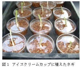 | 1) | あらかじめほ場で育てたネギ(品種:浅黄系九条)葉鞘部を約5cm残して切取り、水を含ませたバーミキュライトを入れたアイスクリームカップ(直径10cm×高さ4.5cm; 200ml)に1株ずつ移植し、25℃長日条件下(15L9D)の恒温器内で栽培する(図1)。 |