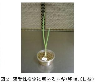 | 2) | 移植後10日程度生育したネギ(草丈約25cm:図2)を、カップのままネギハモグリバエの成虫を約20~30匹放飼したプラスチック飼育ケージ(20cm×20cm×30cm)に入れ、25℃長日条件(15L9D)下に設定した恒温器内で24時間産卵させる。 |