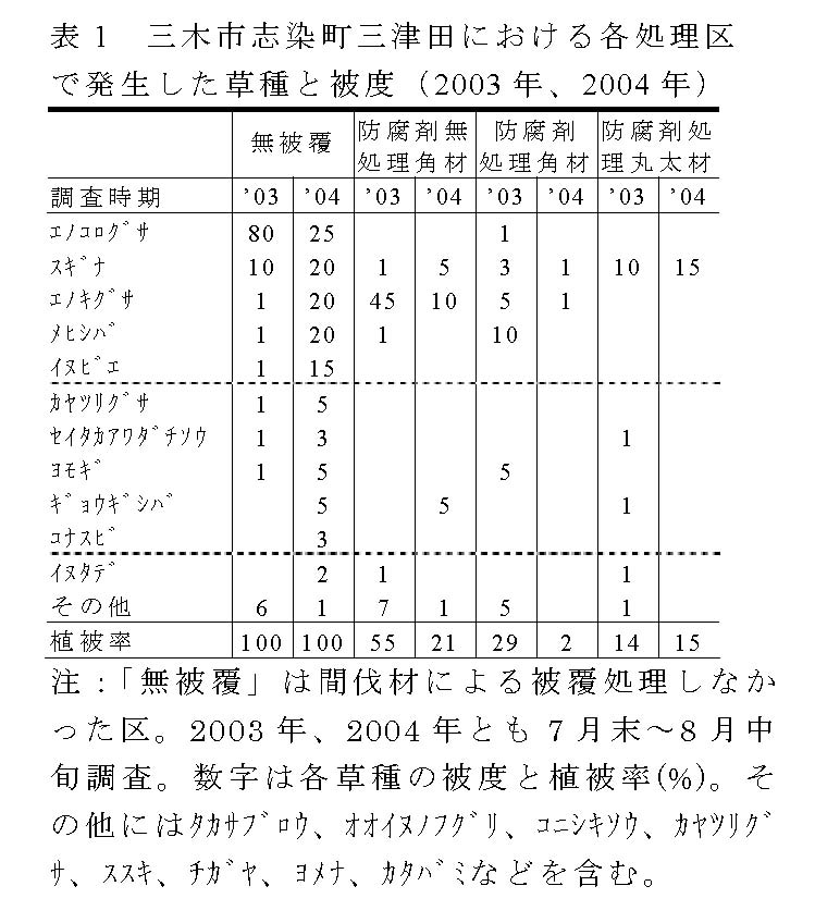 | [成果情報名] | スギ間伐材の被覆による畦畔・法面の雑草抑制技術 |