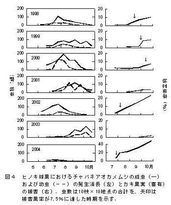 | [要約] | ヒノキ花粉の飛散数比(当年/前年)が低いほど、チャバネアオカメムシなど果樹カメムシ類のカキ園への飛来時期が早まり、被害も多い。またヒノキ球果における幼虫数が減少し始めるとカキ園での被害増加の危険性が高いと予想される。 |