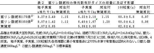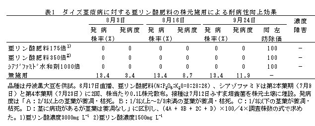 | [成果情報名] | 亜リン酸肥料の施用によるダイズ茎疫病に対する耐病性の向上 |