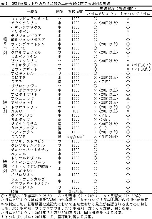 | [成果情報名] | 施設栽培ブドウのハダニ類の土着天敵に対する薬剤の影響 |