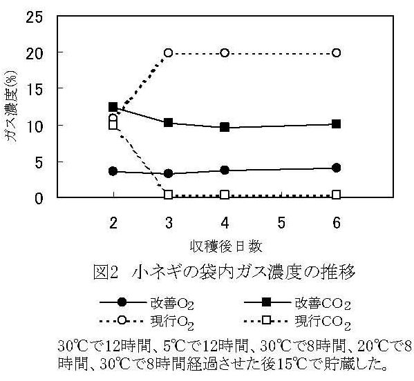 | [要約] | 袋の溶着部分に空隙部を設けてガス透過量を調整するパーシャルシール包装法を小ネギに応用し、段ボール箱と組み合わせた出荷法において、高い鮮度保持効果と低コスト化を認めた。 |