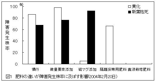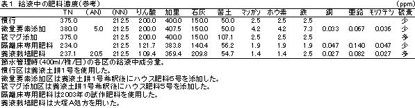 | [要約] | 隔離床を用いた節水管理による高糖度トマト生産において発生する葉の黄化、新葉の枯死といった生理障害を養液栽培肥料の使用によって防止することができる。 |