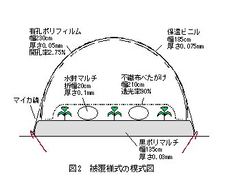| (1) | うね立て、黒ポリマルチ被覆後、保温用の水封マルチを条間に配置し、開孔率3%程度のトンネル用有孔ポリフィルムとビニルフィルムによる二重トンネルを設置する。また、定植後、トンネル内に不織布によるべたがけを行う(図2、3)。 |