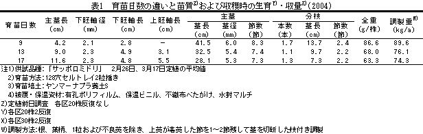 | (3) | 育苗日数は10日から2週間程度とし、順化後定植する。枝付き調製で出荷する場合には、樹勢が旺盛となり枝が大きくなりすぎるため若苗は適さず、初生葉展開期中期を目安に定植する(表1)。 |