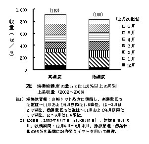 | 4) | 培養液:山崎トマト処方に準拠する。濃度は定植~11月末および4月以降は1.5単位(EC:1.7dS/m)、12月~3月末には2.0単位(EC:2.3dS/m)とする(図2)。 |
