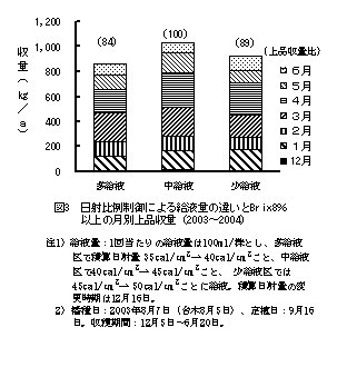 | 5) | 給液量管理:1回1株当たりの給液量は100mlとする。第2花房の開花期までは水分調節用ロックウールの範囲内で湛液が生じるように給液する。第2花房開花期に給液を停止し、軽いしおれがみられてからは日射比例制御方式による自動給液に切り替える。給液のタイミングは第2果房下の葉を摘除する(12月中旬頃)までは積算日射量40cal/cm2ごと、それ以降には45cal/cm2ごと(外日射基準)とする(図3)。 |