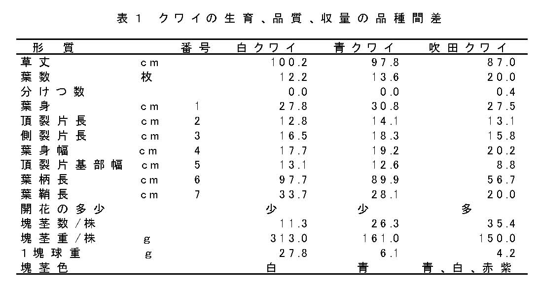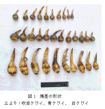 | [要約] | 白クワイの塊茎は大型・扁平であるのに対し、青クワイは丸形、吹田クワイはやや扁平から丸型と形に巾がある。草姿は白クワイが大型、吹田クワイは小型で、青クワイはその中間である。吹田クワイは白クワイや青クワイに比べよく開花・結実する。 |