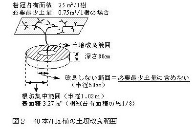 | [要約] | 樹冠占有面積25m2のブドウ「デラウェア」を適正に生育させるために必要な最少土壌容積は0.75m3であり、土壌改良範囲は慣行(幹から半径1.8m、深さ30cm程度)の1/4に縮小できる。深さ30cmで改良を行う場合、土壌改良範囲は樹冠占有面積の約1/8となる。 |