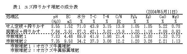 | [成果情報名] | カンキツせん定枝やシイタケ廃菌床を利用したユズ搾りかすの堆肥化法 |