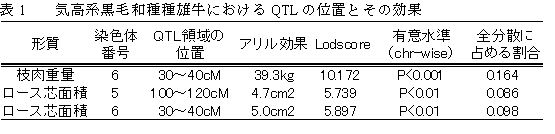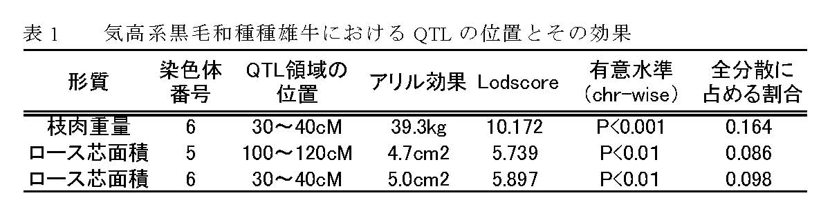 | [成果情報名] | 気高系黒毛和種種雄牛における枝肉重量・ロース芯面積に関するQTLの位置とその効果 |