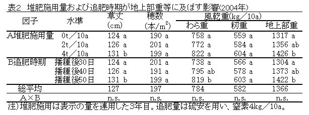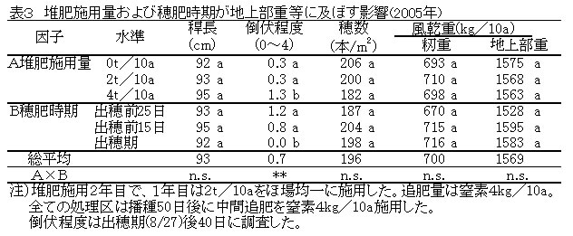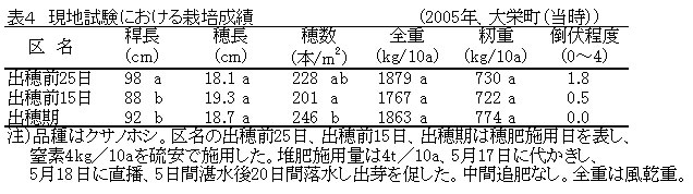| [成果情報名] | 飼料用イネ「クサノホシ」の湛水直播栽培における堆肥施用量と追肥時期 |