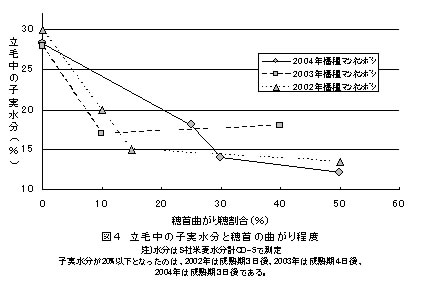 | [要約] | 裸麦は刈取りが早いと、硝子率は高く硬くなり、精麦白度は劣る。刈取りが遅くなると容積重が低下する。品質低下を防ぐには、裸麦「マンネンボシ」は穂首の曲がった穂の割合が20%程度の時から刈取りを開始する。 |