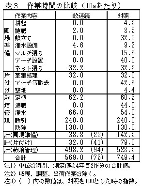 | [要約] | 夏秋キュウリ栽培において、前作の畝を利用する不耕起栽培にかん水同時施肥法を組み合わせることで、作毎に耕起する栽培と同程度の収量が得られ、大幅な省力化を図ることができる。 |