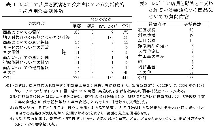 | [要約] | 農産物直売所のレジ上での店員と顧客の会話からは、商品の在庫質問や、購入目的と購入の可否、良悪の評価等の消費者情報が把握できる。購入目的の情報は、店員からの問いかけで増加するが、入荷予定や未入荷理由の顧客への情報伝達は十分でない。 |