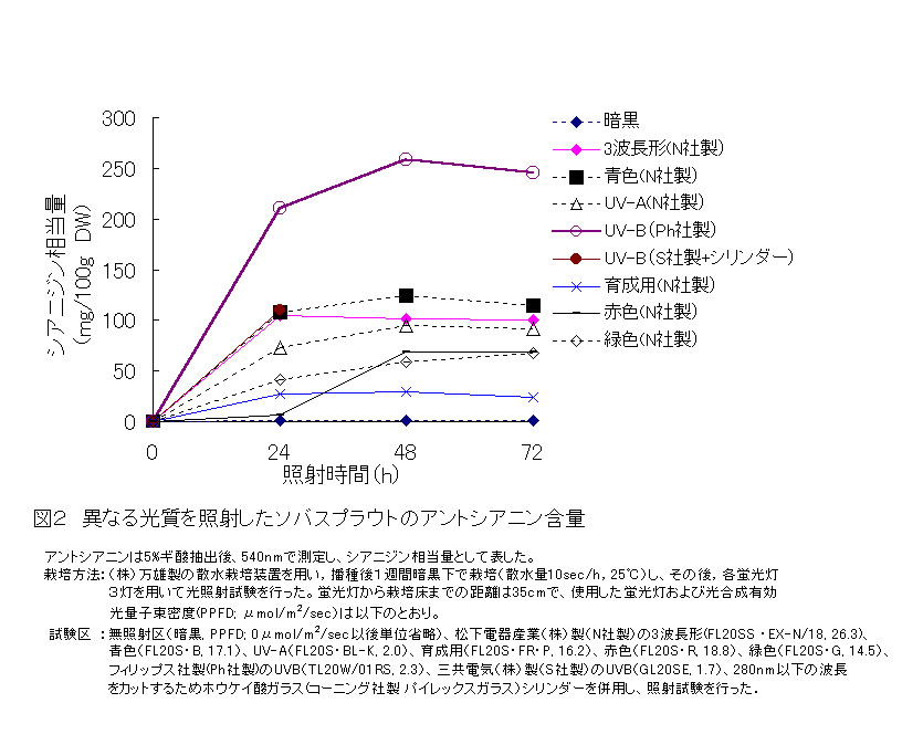 | [要約] | ソバスプラウトのアントシアニンを効率的に生成させるためには、300nm以下の 波長を含まないUVB領域の光を24~48時間照射することが有効である。 |