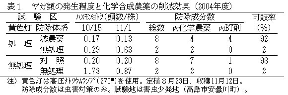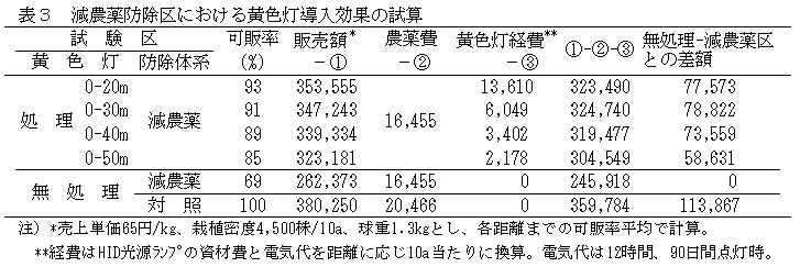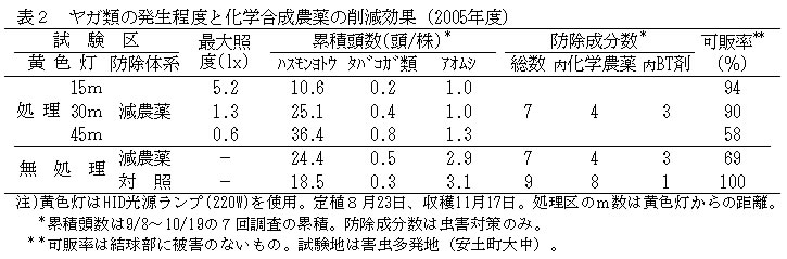 | [成果情報名] | 黄色灯を利用したキャベツの化学合成農薬削減技術 |