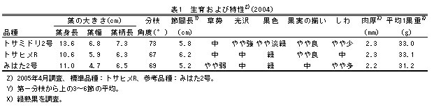 | 2) | 第1分枝の角度はやや広く、葉の大きさはやや大きい。果面の光沢はやや強く、揃いはやや良、しわはやや少ない。果色はやや淡緑である(表1)。 |