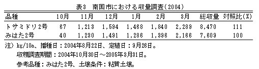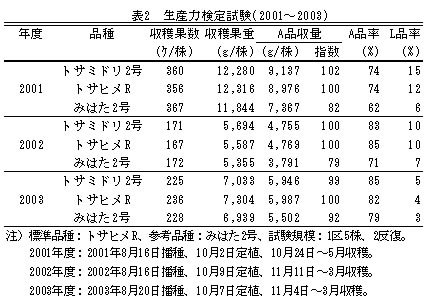 | 3) | A品収量は「みはた2号」に比べ多く、「トサヒメR」と同等である。L品率は「トサヒメR」並である(表2)。 |