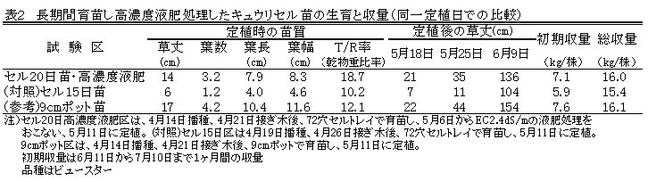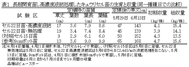 | [成果情報名] | セル苗キュウリへの高濃度液肥施用による活着と初期生育の促進 |