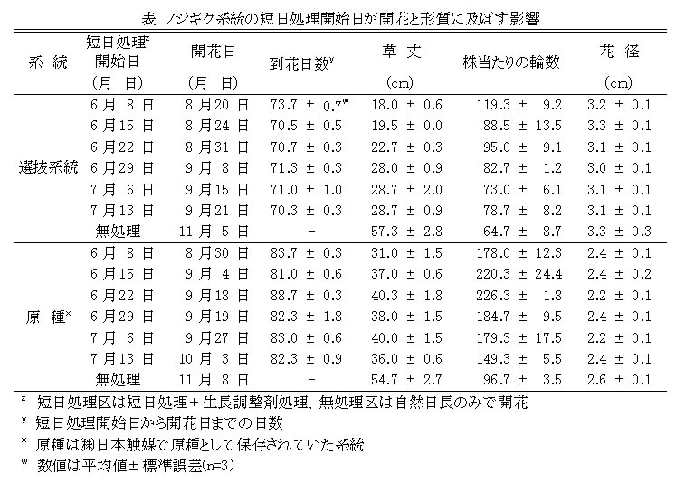 | [要約] | 日長感応性と生長調整剤の効果を基準に選抜したノジギクの系統は、高温期の短日処理でも安定して短い日数で開花し、生長調整剤による草姿改善効果が高く、鉢花商品として有望である。 |