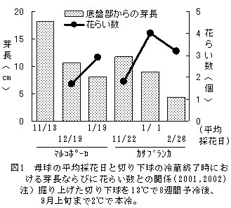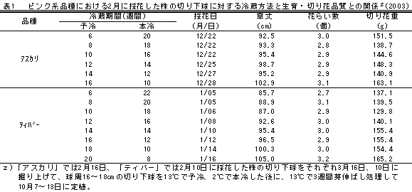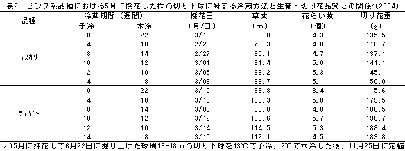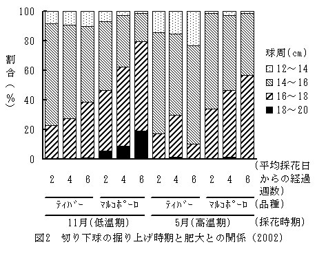 | [要約] | ‘マルコポーロ’等の1月以降に採花した切り下球を平均採花日の4~6週間後に掘り上げ、品種や茎軸の伸長の有無に応じた冷蔵処理をすることで、冷凍球の利用が困難な10~12月に定植でき、これにより種苗費の低減と安定生産が可能となる。 |