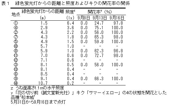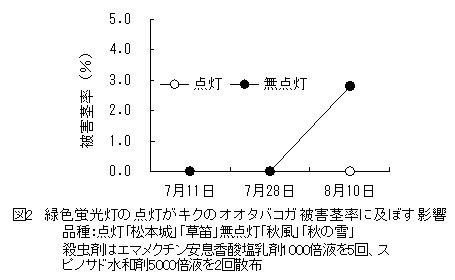 | [成果情報名] | 緑色蛍光灯が9月咲きギクの開花とオオタバコガ防除効果に及ぼす影響 |