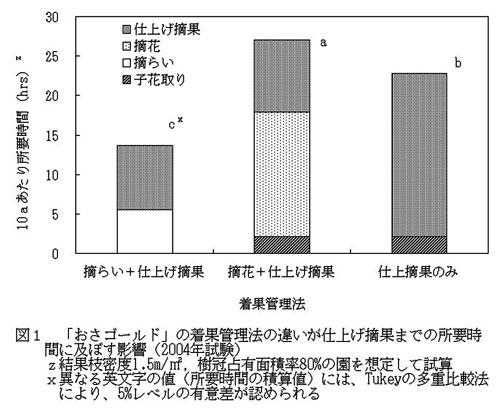 | [要約] | 自家和合性のナシ「おさゴールド」は結実数が多く、摘果が遅れると小果になりやすいが、摘らい、摘花と仕上げ摘果を併用することで、摘果に集中する作業時間を分散でき、大果生産が可能となる。 |