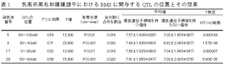 | [成果情報名] | 気高系黒毛和種種雄牛における脂肪交雑(BMS)に関与するQTLの位置とその効果 |