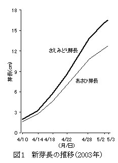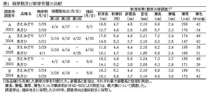 | [要約] | 「さえみどり」は、本ず及び黒色化繊被覆下のてん茶の自然仕立て栽培において、「あさひ」と比べ萌芽期が2日~4日早く、新芽長の増加率が大きいことから、摘採適期がやや早い。同日に摘採した場合、生葉収量が3割~5割多い。てん茶として滋味が濃厚であるが、製茶品質は「あさひ」に及ばない。 |