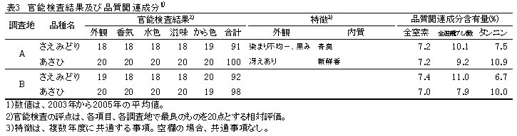 | 研究課題名 | : | 品種に関する調査 3.「さえみどり」のてん茶適性試験(現地試験) |