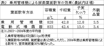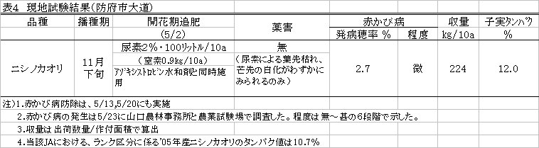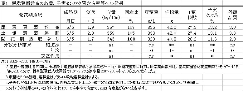 | [成果情報名] | 小麦「ニシノカオリ」における赤かび病防除同時尿素葉面散布による開花期追肥 |