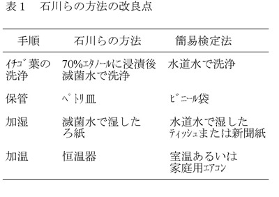 | [要約] | イチゴ炭疽病潜在感染を検出できる石川らの簡易検定法を、輪ゴム、ティッシュ、ビニール袋という 手に入りやすい道具を利用する方法に改良しても検出が可能である。 |