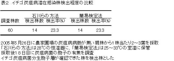 | [キーワード] | イチゴ、炭疽病、簡易検定法 |