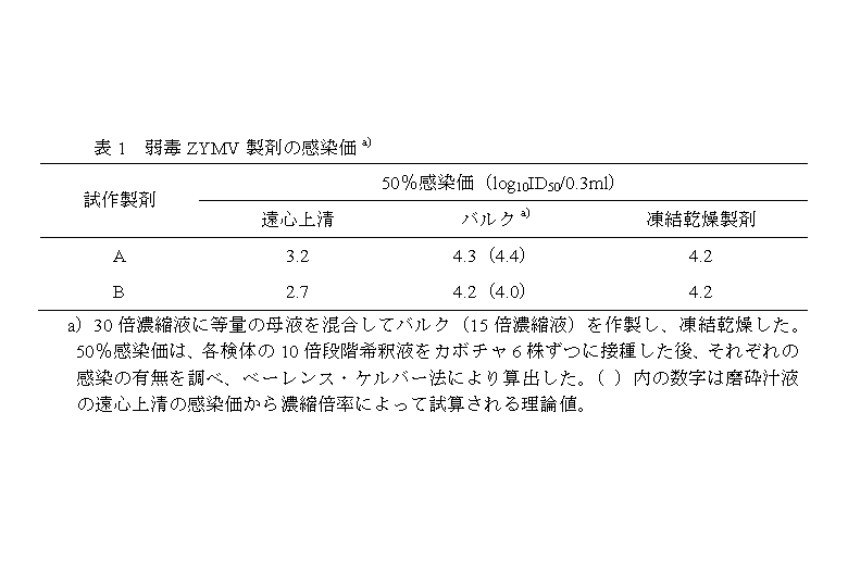 | [キーワード] | 限外ろ過、弱毒ウイルス、高力価製剤、ズッキーニ黄斑モザイクウイルス |