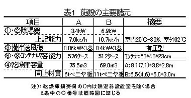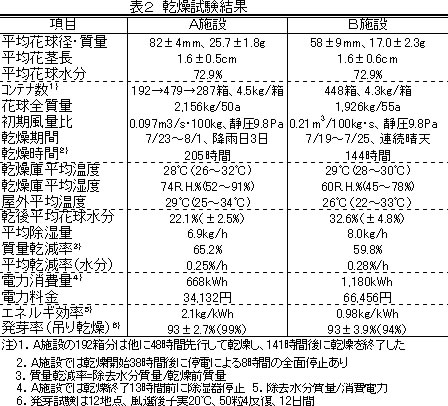 | [要約] | 本施設は、効率的乾燥と発芽率維持の観点から、花球の適期収穫と乾燥終了時水分30%(w.b.)を 前提に、温度28~30℃、湿度60~70%(R.H.)、6日間の乾燥とし、初期張込み質量の上限を除湿機能力 3.4kW型では1,700kg、6.9kW型では2,600kg とする。 |