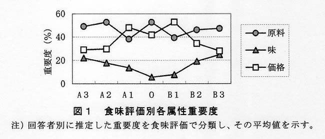 | [要約] | 2種類の豆腐の食味試験と「原料」、「味」、「価格」を属性とするコンジョイント分析を 行った結果、一方の豆腐に対して食味が非常に優れると評価する回答者は、そうでない回答者よりも 「味」の重要度が高く、「価格」の重要度が低い。食味が優れると感じる豆腐に対する選好の度合いは、 味に対する評価額として反映される。 |