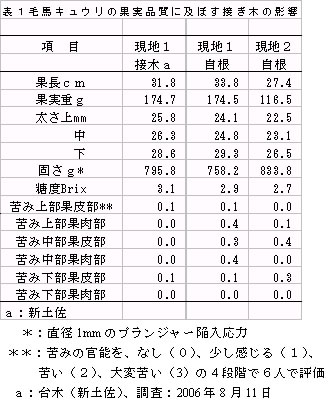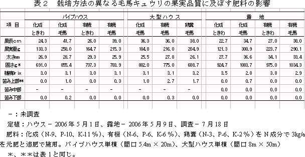 | [成果情報名] | 在来「毛馬」キュウリの苦み果発現に及ぼす接ぎ木、肥料の影響 |