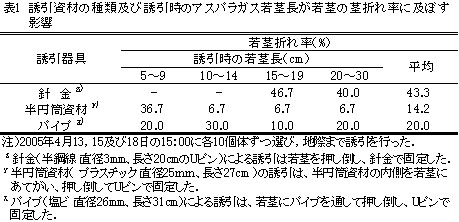 | [成果情報名] | アスパラガス若茎を地際に押し倒して立茎させる誘引法 |
