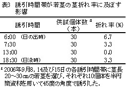 | [要約] | アスパラガス全期立茎栽培において、母茎となる若茎を畝間方向に押し倒して母茎を列状に 形成させる誘引法を開発した。誘引は,若茎に半円筒資材の内側をあてがい、45度の角度まで倒し、再度、 曲がり癖のつく2日後に地際まで押し倒す。 |