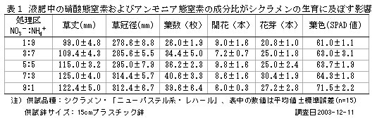 | [成果情報名] | 鉢花シクラメン高品質生産のための窒素形態の好適成分比 |