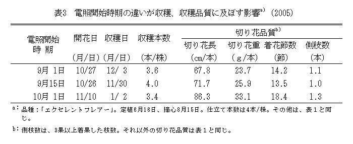 | [要約] | ヒペリカムを、6~8月に定植し、9月中旬までに摘心を行い、最低夜温12℃、3時間の暗期中断で 栽培すると、11~1月と4~6月の2回の収穫ができる。11月収穫ではシングルタイプが多く、 それ以降では、スプレイタイプの品質のものが収穫できる。 |