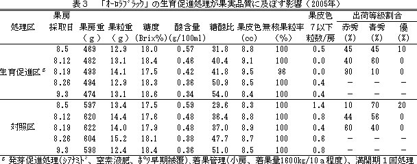 | [要約] | 「オーロラブラック」に発芽促進処理(発芽促進剤、ポリ早期被覆)、着果管理(小房化、着果制限)、 ホルモン処理(満開期1回処理または肥大処理をフルメットで処理)を組み合わせることにより、 トンネル作型での盆前収穫が可能である。 |