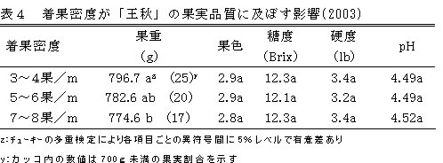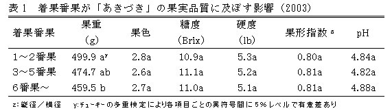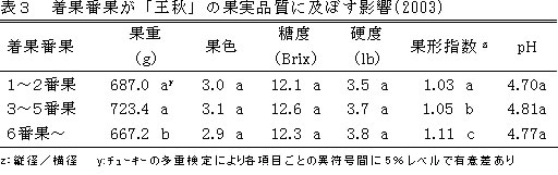 | [要約] | 「あきづき」「王秋」は、3~5番果で、側枝1mあたりに、5~6果の果実を着果させることにより 品質のよい果実を得ることができる。 |