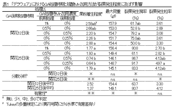 | [要約] | 「デラウェア」ではジベレリン後期処理を遅れないように処理し、さらに硫酸マンガンを無加用と することにより果粉着生が促され、表皮細胞が発達し裂果が軽減できる。 |