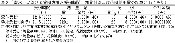 | [成果情報名] | 「幸水」における新規液体増量剤を用いた溶液受粉技術 |