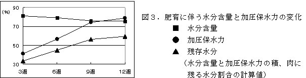 | [要約] | 肉用あひる大阪種の胸肉の遊離グルタミン酸は3から12週の肥育期間に1.5倍に、保水力は約2倍に、 剪断力価は1.5倍に全て増加する。この味や歯ごたえは6週以降も増加しており、高品質なあひる肉の 生産のためには、10週以上の肥育期間が必要である。 |