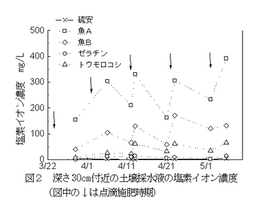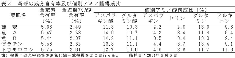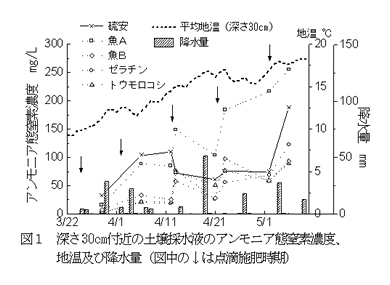 | [要約] | 覆い下茶園の点滴施肥に、魚、ゼラチン及びトウモロコシ由来液肥を用いると、硫安液肥とほぼ同等の 品質が得られるが、魚及びトウモロコシ由来液肥は、土壌の塩素イオン濃度が高まりやすい。 |