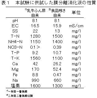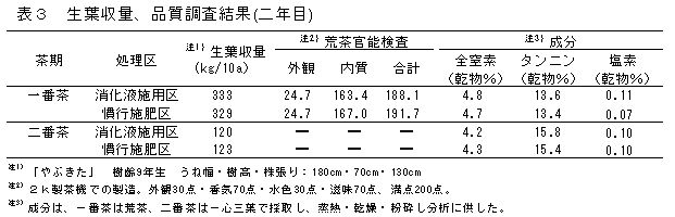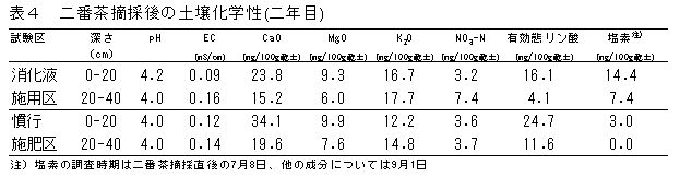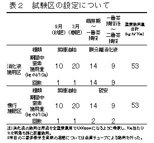 | [成果情報名] | 畜産ふん尿・食品残さ由来膜分離消化液を追肥として施用した場合のチャへの影響 |